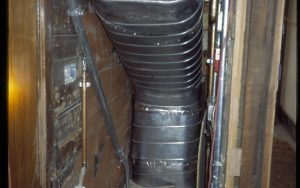 View of new HVAC ductwork installed during 1987-1988 Restoration. Ductwork is in first floor, Dining Room closet, under west stairwell. Photographer facing west.