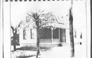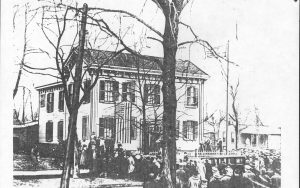 View of Lincoln Home with Arnold House in background; taken at 1919 celebration. Appears to show off-set on west side, see roof configuration (Only photos of pre-1900 Arnold House exist in background of Lincoln Home photos) LIHO NHS- Arnold House, #12 Arnold House, Lincoln Home
