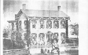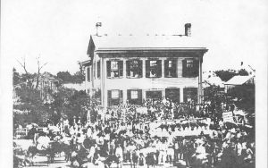 Political rally in 1860; includes Lincoln. Shows north have of Arnold Barn (only photos of pre-1900 Arnold House exist in background of Lincoln Home photos) LIHO NHS- Arnold House, #1 Arnold House, Lincoln Home