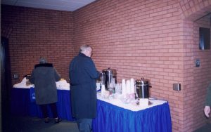 Lincoln's Birthday - visitors enjoying the refreshment tables in the space between the theaters in Visitor Center. Looking Southeast from main area Lincoln's birthday, refreshments, visitors, Visitor Center