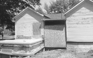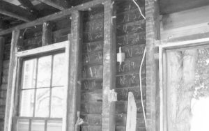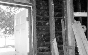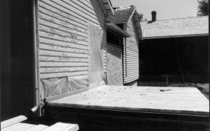 Siding on inside of North wall is numbered before removal and preparation for reinstallation. Shows East side of North wall (door at left) Lincoln Home NHS- Corneau House Restoration, roll N12 exp 10 Corneau House, excavation