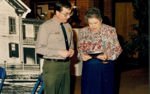 Former Ranger Ruth Ketchum with Supt. Norm Hellmers in Visitor Center Looking East near exhibits staff, Visitor Center Former Ranger Ruth Ketchum with Supt. Norm Hellmers in Visitor Center Looking East near exhibits staff, Visitor Center