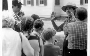 Ranger Ruth Ketchum giving a neighborhood walking tour near the Robinson House Looking Southwest in front of Jenkins lot staff, neighborhood tour, Robinson
