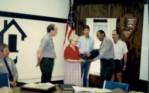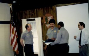 Awards Ceremony - Supt. Gentry Davis hands an award to Joyce Mavis as Rangers George Painter and Larry Blake watch, with Jason Hammond and Kelly Dodsworth. Looking Southwest in Conference Center, second floor staff, Conference Center, awards