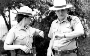 Chief of Operations Larry Blake and Law Enforcement Ranger Mosie Maxey sychronize their watches prior to Reopening events Reopening? staff, Lincoln neighborhood, Reopening(?)