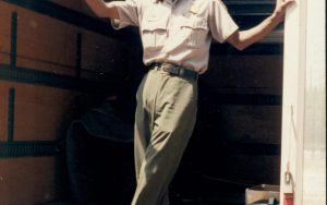 Ranger Melvin Cole waving while standing on a truck tailgate staff, truck Ranger Melvin Cole waving while standing on a truck tailgate staff, truck