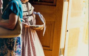 Lady in period dress standing in doorway. Old State Capitol, Decorations Lady in period dress standing in doorway. Old State Capitol, Decorations