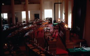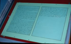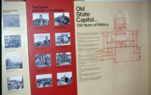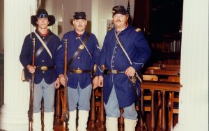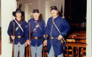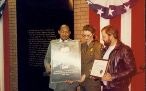 Staff and volunteer (?) accepting awards. Supt. Gentry Davis and Ranger Cat Mancuso accept award from the ISHL. Volunteer Tim K? accepts Master Communicator award in the Visitor Center near the Farewell Address panel. Looking South. staff, awards, volunteer, Visitor Center