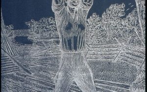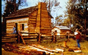 Log cabin & man in period dress splitting logs. New Salem Log cabin & man in period dress splitting logs. New Salem
