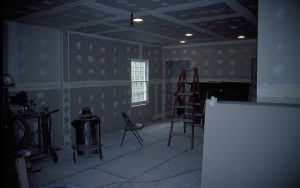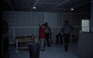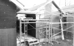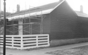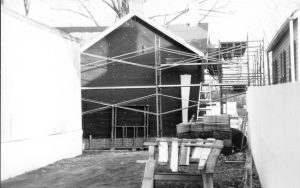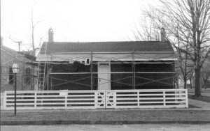Corneau - restoration, scaffolding installed on South and West elevations. Temporary restroom building in foreground left. Sprigg House on right on other side of fence. Looking East from Corneau Lot (Block 6, Lot 16) Corneau, restoration, scaffolding, temporary, restroom, Sprigg