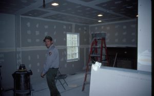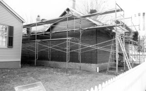 Corneau - restoration, scaffolding installed on East elevation. Sprigg House on left. Looking West from 8th Street Corneau, restoration, scaffolding, Sprigg, 8th Street
