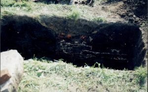 Uncovered foundation while searching for 1880s barn. apperas to be associated with later structure. Photo taken looking East along North side of property line Lincoln Home NHS- Corneau House Restoration, roll N6 exp 18 Corneau House, restoration