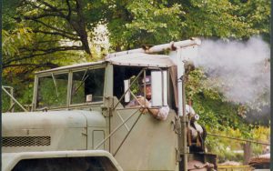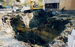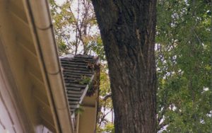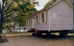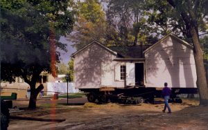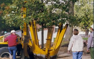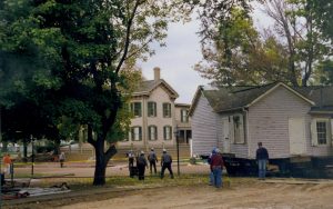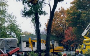 Cutting down trees at Southwest corner of 8th/Jackson intersection; in prep for moving Corneau House to front of lot. East elevation in background. Photo taken from East side of 8th St. Lincoln Home NHS- Corneau House and Lot, Roll N5 exp 4 Corneau, move