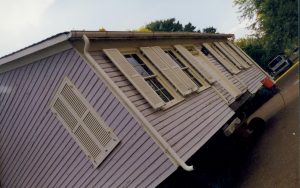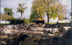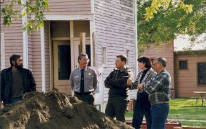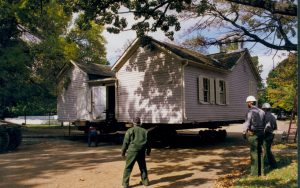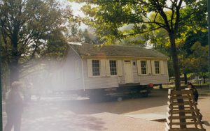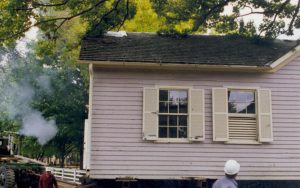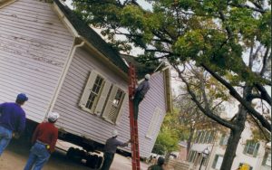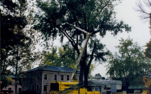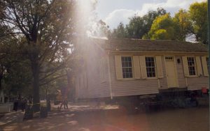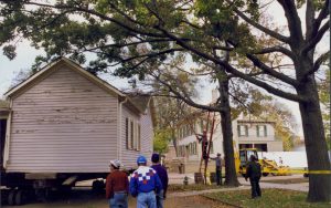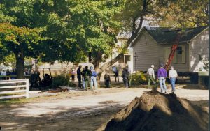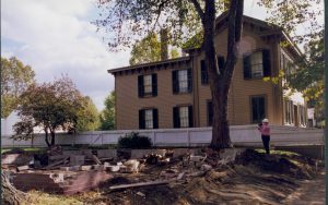 Cutting down trees at Southwest corner of 8th/Jackson intersection; in prep for moving Corneau House to front of lot. Photo taken from Northeast part of intersection. Northeast corner of Miller in background Lincoln Home NHS- Corneau House and Lot, Roll N5 exp 2 Corneau, move
