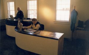 Temporary Visitor Center desk Lincoln Home NHS- Visitor Center remodel, Roll 1999-15 exp 13 Visitor Center, Arnold, temporary Temporary Visitor Center desk Lincoln Home NHS- Visitor Center remodel, Roll 1999-15 exp 13 Visitor Center, Arnold, temporary