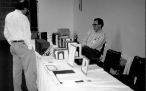Man standing at book table, one seated. Lincoln Colloquium; UIS Roll#1, 1of4 Lincoln, Colloquium Man standing at book table, one seated. Lincoln Colloquium; UIS Roll#1, 1of4 Lincoln, Colloquium