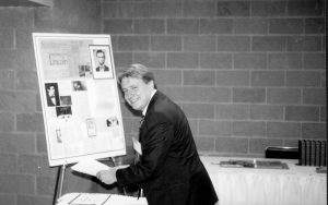 Man picking up literature at exhibit. Lincoln Colloquium; UIS Roll#2, 3of4 Lincoln, Colloquium Man picking up literature at exhibit. Lincoln Colloquium; UIS Roll#2, 3of4 Lincoln, Colloquium