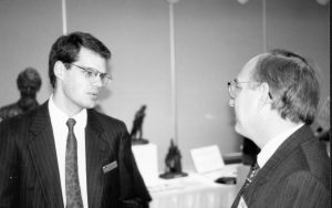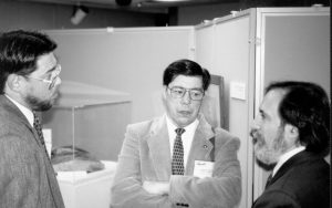 Man in light coat talking to two visitors. Lincoln Colloquium; UIS Roll#2, 3of4 Lincoln, Colloquium Man in light coat talking to two visitors. Lincoln Colloquium; UIS Roll#2, 3of4 Lincoln, Colloquium