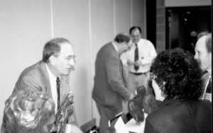 Man behind schulpture talking to two visitors. Lincoln Colloquium; UIS Roll#2, 1of4 Lincoln, Colloquium Man behind schulpture talking to two visitors. Lincoln Colloquium; UIS Roll#2, 1of4 Lincoln, Colloquium
