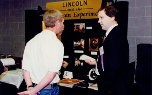 Two men talking in front of exhibit. Lincoln Colloquium Lincoln, Colloquium Two men talking in front of exhibit. Lincoln Colloquium Lincoln, Colloquium