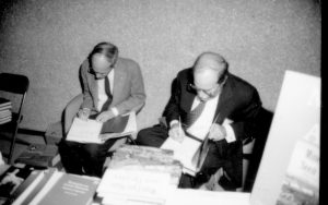 Two men seated behind book table singing books. 8th Annual Lincoln Colloquium; E Lincoln, Colloquium Two men seated behind book table singing books. 8th Annual Lincoln Colloquium; E Lincoln, Colloquium