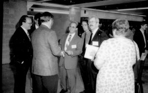 Group of men (one woman) standing, talking. 8th Annual Lincoln Colloquium; A Lincoln, Colloquium Group of men (one woman) standing, talking. 8th Annual Lincoln Colloquium; A Lincoln, Colloquium