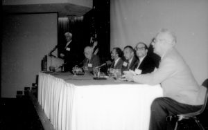 Speakers sitting at table, one at podium. 8th Annual Lincoln Colloquium; E Lincoln, Colloquium Speakers sitting at table, one at podium. 8th Annual Lincoln Colloquium; E Lincoln, Colloquium