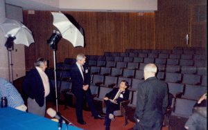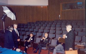 Three men seated, three standing in empty auditorum. 1992 Lincoln Colloquium Lincoln, Colloquium Three men seated, three standing in empty auditorum. 1992 Lincoln Colloquium Lincoln, Colloquium