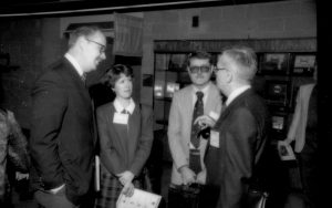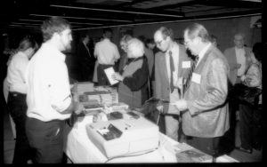 Lady and two men at literature table. 1992 Lincoln Colloquium; Outside #72 Lincoln, Colloquium Lady and two men at literature table. 1992 Lincoln Colloquium; Outside #72 Lincoln, Colloquium