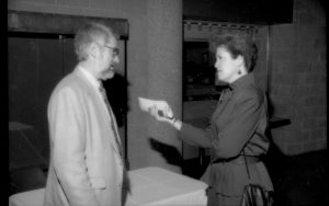 Lady with booklet talking to man. 1992 Lincoln Colloquium; Outside #72 Lincoln, Colloquium Lady with booklet talking to man. 1992 Lincoln Colloquium; Outside #72 Lincoln, Colloquium