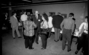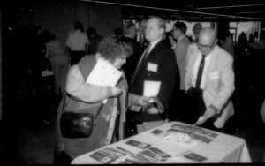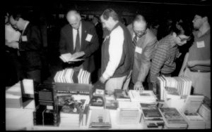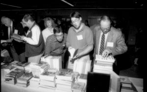 Attendees at book tables 1992 Lincoln Colloquium; Outside #72 Lincoln, Colloquium Attendees at book tables 1992 Lincoln Colloquium; Outside #72 Lincoln, Colloquium