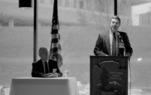Man behind NPS podium speaking. Colloquium, 1991 Lincoln, Colloquium Man behind NPS podium speaking. Colloquium, 1991 Lincoln, Colloquium