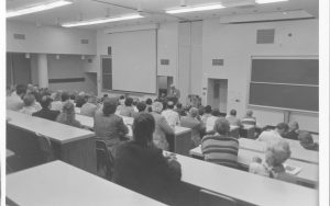 Group of people in large lecture room. Lincoln, Colloquium Group of people in large lecture room. Lincoln, Colloquium