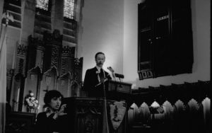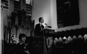 Merrill Beal, NPS Regional Director delivers speech to audience dedicating new visitor center at LIHO. To accommodate the crowd of 650, the program was held at the 1st Presbyterian Church. Lincoln Home NHS- Visitor Center Dedication Ceremony church, ceremony, dedication