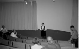 Lady speaking to visitors in theater. Lincoln Colloquium; UIS Roll#1, 4of4 Lincoln, Colloquium Lady speaking to visitors in theater. Lincoln Colloquium; UIS Roll#1, 4of4 Lincoln, Colloquium
