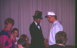 Reenactor shaking hands with visitor. Lincoln Colloquium Lincoln, Colloquium Reenactor shaking hands with visitor. Lincoln Colloquium Lincoln, Colloquium