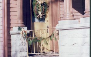 Lincoln Home NHS- Christmas in Lincoln Neighborhood Looking west, Christmas wreath hanging from Dean house porch. Detail. Christmas, neighborhood, wreath, detail, Dean, porch