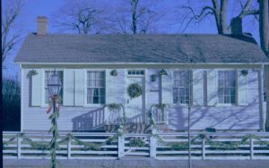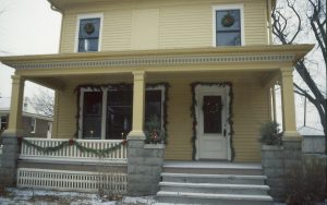 Lincoln Home NHS- Christmas in Lincoln Neighborhood Looking east from yard, Cook house and porch decorated for Christmas, Arnold in background. Christmas, decorations, decor, Cook, Arnold, wreath, garland, snow, porch