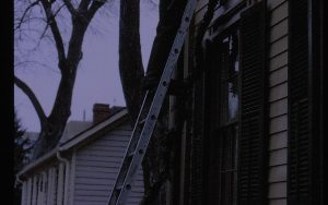 Lincoln Home NHS- Christmas in Lincoln Neighborhood Looking north, maintenance staff hanging garland on Lincoln home west face. Detail. Christmas, decorations, Lincoln, staff, ladder, garland