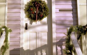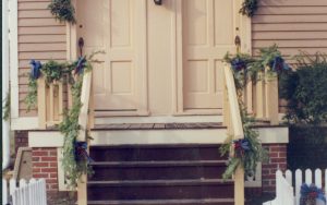 Lincoln Home NHS- Christmas in Lincoln Neighborhood Looking west from steps, Sprigg house door and porch decorated for Christmas. Detail. Christmas, decorations, Sprigg, decor, wreath, garland, door, porch