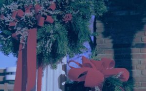 Lincoln Home NHS- Christmas in Lincoln Neighborhood Looking north east, Christmas decor on Conference Center porch. Detail. Christmas, decorations, Conference, center, decor, porch, wreath, garland