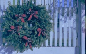 Lincoln Home NHS- Christmas in Lincoln Neighborhood Looking east, wreath hanging on Robinson house gate. Detail. Christmas, decorations, Robinson, gate, fence, wreath, decor