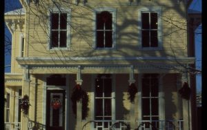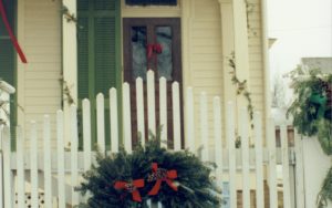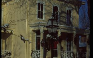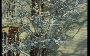 Lincoln Home NHS- Christmas in Lincoln Neighborhood Looking north west from yard, Shutt house decorated for Christmas. Detail. Christmas, decorations, Shutt, decor, snow, wreath, garland