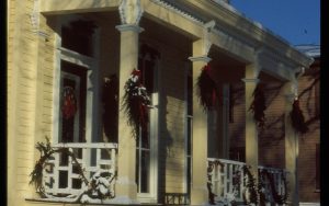 Lincoln Home NHS- Christmas in Lincoln Neighborhood Looking north west from boardwalk, Dean house decorated for Christmas. Christmas, decorations, decor, Dean, wreath, garland