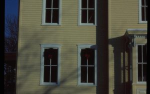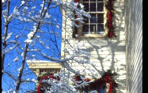 Lincoln Home NHS- Christmas in Lincoln Neighborhood Looking north from yard, south face of west wing of Shutt house decorated for Christmas. Detail. Christmas, decorations, Shutt, wreath, decor, snow