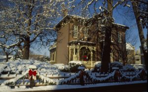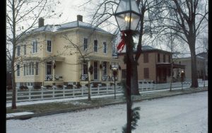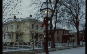 Lincoln Home NHS- Christmas in Lincoln Neighborhood Looking west from 8th Street, Shutt house decorated for Christmas. Christmas, decorations, Shutt, wreath, garland, snow