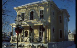 Lincoln Home NHS- Christmas in Lincoln Neighborhood Looking north west from boardwalk, Shutt house decorated for Christmas. Detail. Christmas, decorations, Shutt, decor, snow, tree, garland
