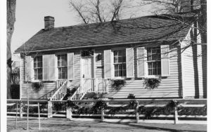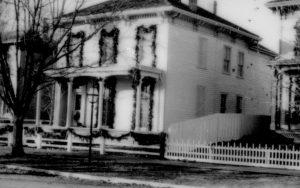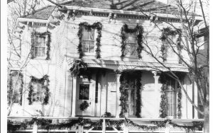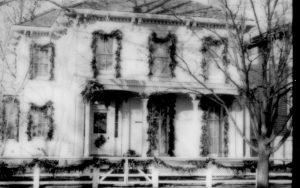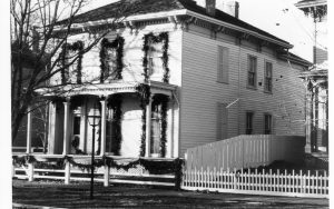 Lincoln Home NHS- Christmas in Lincoln Neighborhood Looking south west from 8th Street, Dean house decorated for Christmas. Christmas, neighborhood, Dean, wreath, garland, fence, decor