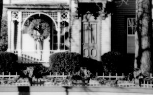 Lincoln Home NHS- Christmas in Lincoln Neighborhood Looking west from 8th Street, Rosenwald house decorated for Christmas. Christmas, neighborhood, Rosenwald, Lyon, decor, garland, wreath, porch, fence