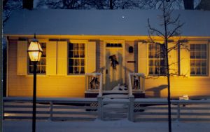 Lincoln Home NHS- Christmas in Lincoln Neighborhood Looking north, Christmas decor on porch of Corneau house. neighborhood, night, Christmas, sleigh, Corneau, wreath, garland, porch